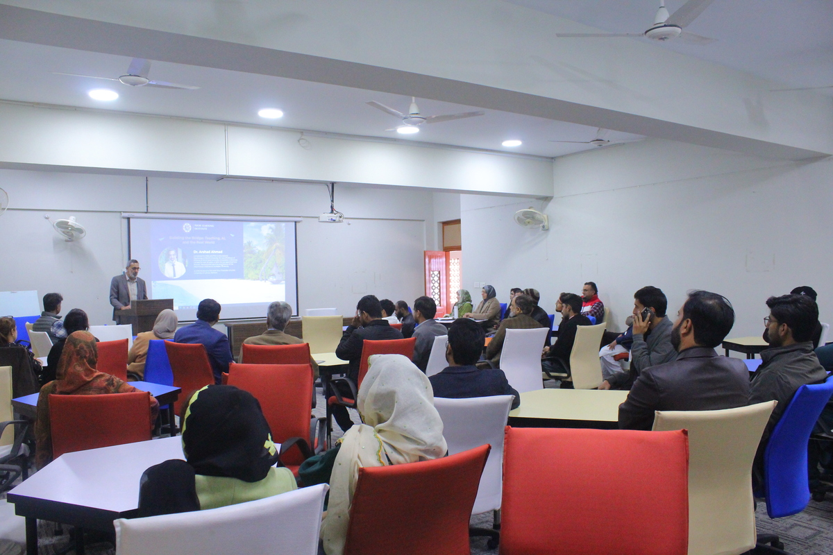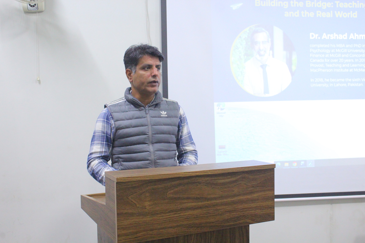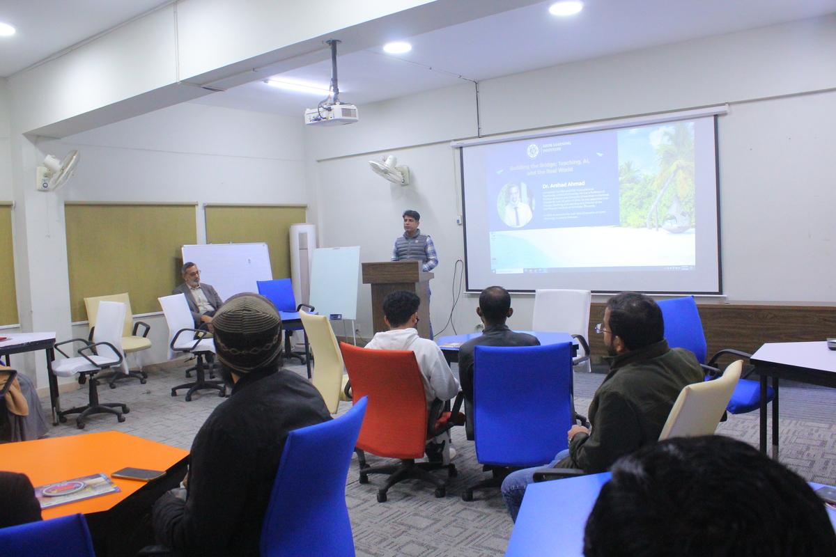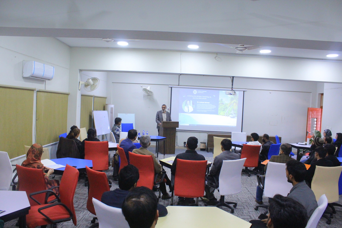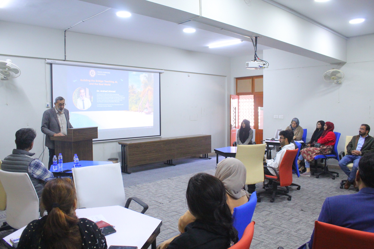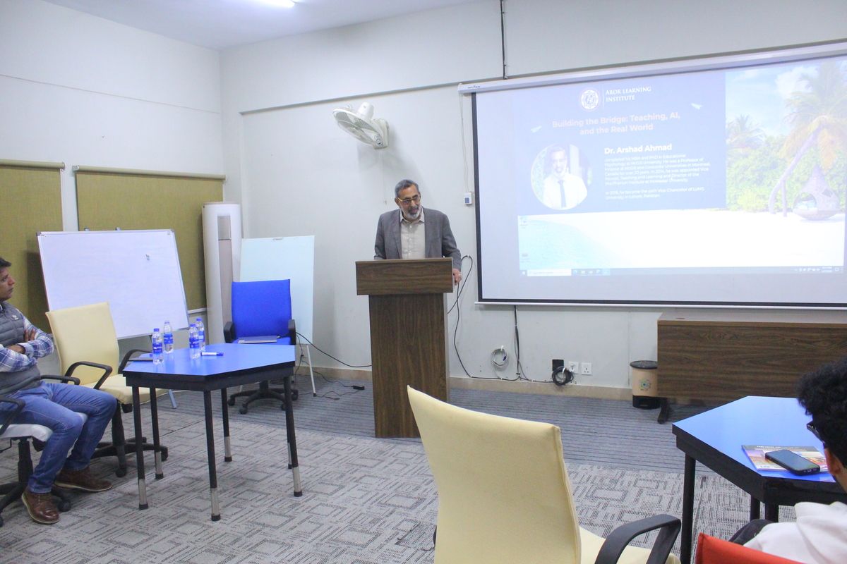 The Aror Learning Institute (ALI) organized an interactive faculty development session titled “Building the Bridge: Teaching AI and the Real World” on 27 January 2026 at Aror University. The session was led by Dr. Arshad Ahmad, Former Vice Chancellor of LUMS, and focused on bridging the gap between artificial intelligence and real-world teaching practices.